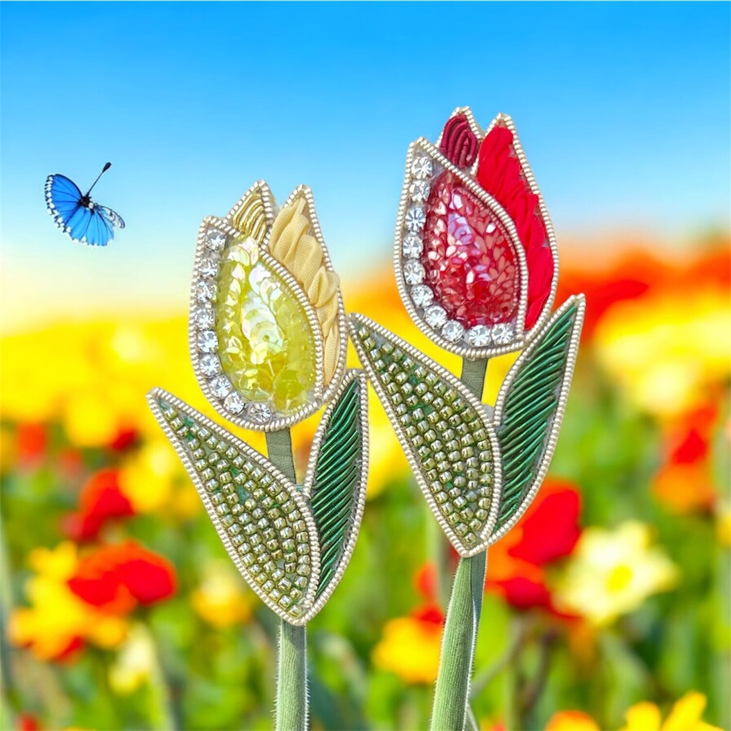 チューリップの美しい花をモチーフにしたブローチキットです。ビーズや刺繍糸を使い、立体感のある仕上がりが特徴です。